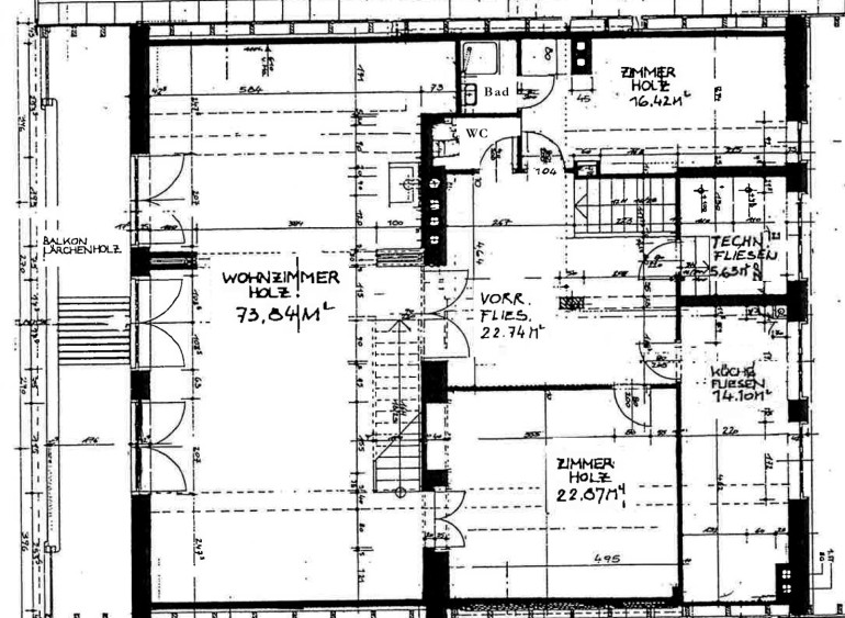 Die Wohnung ist zweigeschoßig und besteht im Untergeschoß aus Vorraum, großzügigem Wohnraum (ca 73m²) mit offenem Kamin und Süd-Balkon, Speisezimmer, Komplettküche mit kleinem Essplatz, Schlafzimmer mit kleinem Duschbad, Gäste-WC extra sowie Technik-/Abstellraum.
