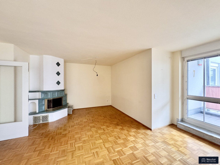 Das Herzstück der Wohnung bildet das großzügige Wohnzimmer mit funktionstüchtigem Kamin. Das einladende Glasfenster ermöglicht einen stimmungsvollen Blick auf das Feuer und schafft besonders in der kühleren Jahreszeit eine warme, behagliche Atmosphäre – ein echtes Highlight mit Seltenheitswert in einer Mietwohnung.