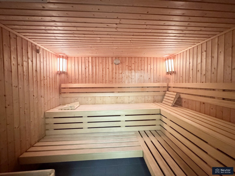 Parkett, Fliesen, Teppichboden, Gas, Zentralheizung, Einbauküche, Personenaufzug, Südbalkon, Westbalkon, Badewanne, Kabel/Satelliten-TV, Alarmanlage, Sauna, Wasch/Trockenraum