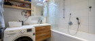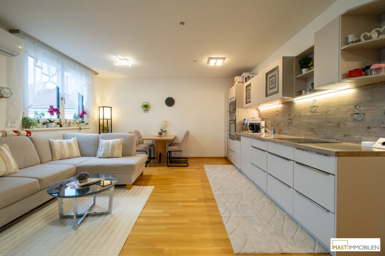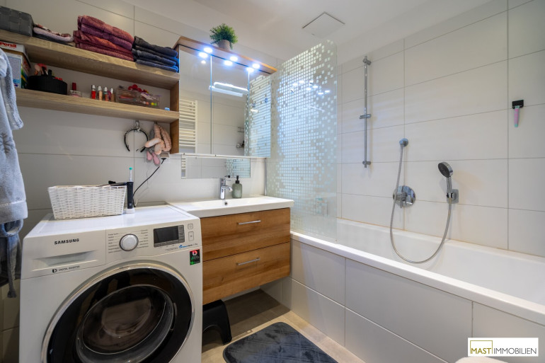 Die moderne Einbauküche inklusive aller Geräte ist funktional wie stilvoll gestaltet und fügt sich harmonisch in den Wohnraum ein. Das Badezimmer ist mit einer Badewanne ausgestattet, zusätzlich steht ein separates WC mit Waschbecken zur Verfügung – ein echtes Plus im Alltag.