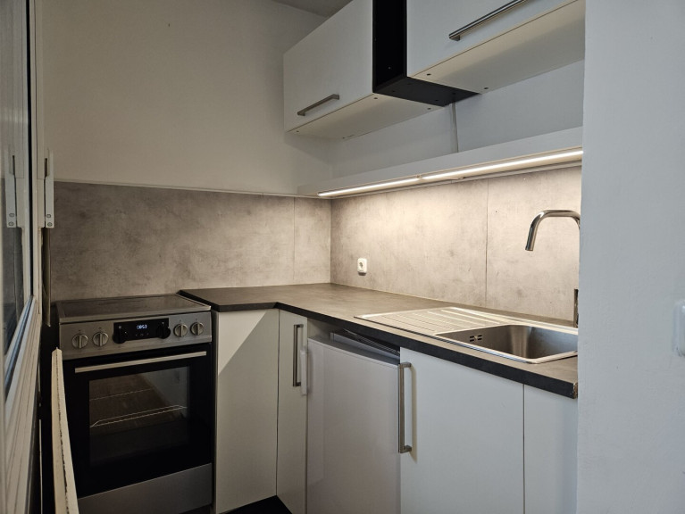 Die Einbauküche verfügt über E-Herd, Backrohr, Kühlschrank und Spüle und ist optisch vom Wohnbereich abgetrennt.