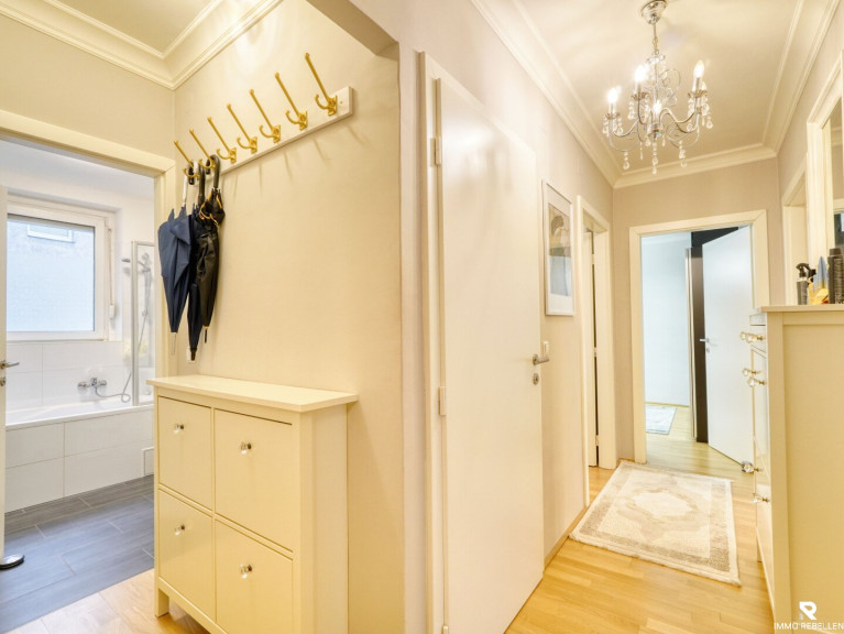 Die Wohnung befindet sich im 1. Liftstock eines gepflegten Hauses und überzeugt bereits beim Eintreten mit ihrem besonderen Charme. Die großzügigen Räume wirken hell und einladend, während die stilvollen Details an den Decken und Wänden eine elegante Wohnatmosphäre schaffen.