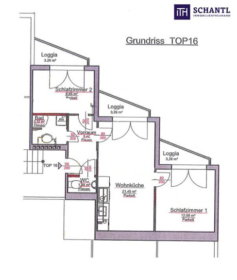 Über einen einladenden Vorraum gelangen Sie in die großzügig gestaltete Wohnküche sowie eines der beiden Schlafzimmer, Badezimmer mit Dusche und Waschmaschinenanschluss sowie das WC. Das zweite Schlafzimmer begehen Sie über die Wohnküche. Ein Highlight sind sicherlich die 3 Loggien, die von allen 3 Zimmern getrennt zu begehen sind. Hier können Sie sich nach einem anstrengenden Arbeitstag erholen!