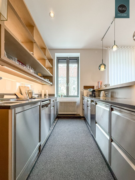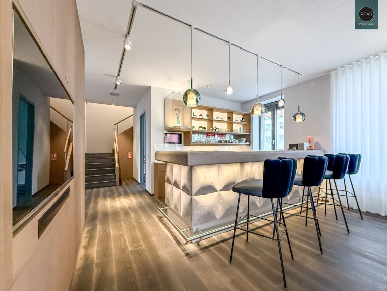 - 1 Großraum mit Einbaumöbel inkl. TV sowie Einbauküche/Bar inkl. hochwertiger Gastro-Geräte (Ideal zur Bewirtung oder für Events)