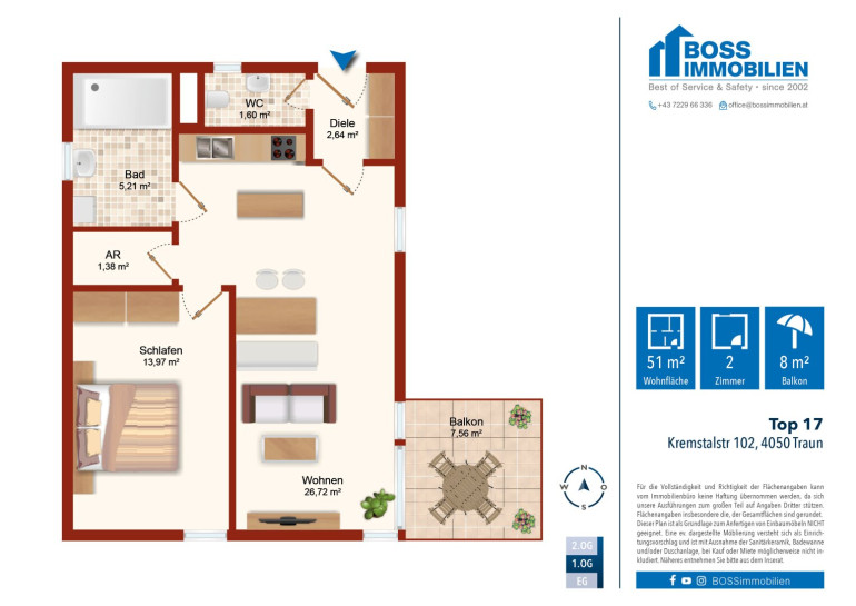 Die Lage in Traun zählt zu den großen Pluspunkten dieser Wohnanlage. Hier genießen Bewohner eine sehr gute Anbindung und kurze Wege – eine Kombination, die ein entspanntes, komfortables Wohnen ermöglicht.