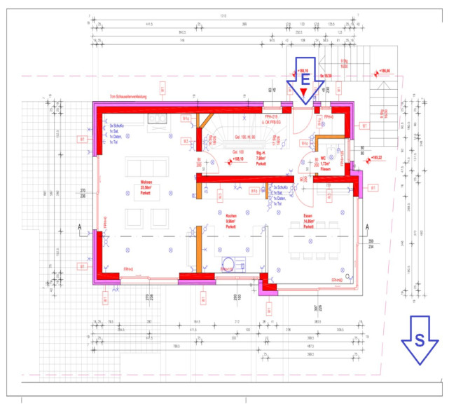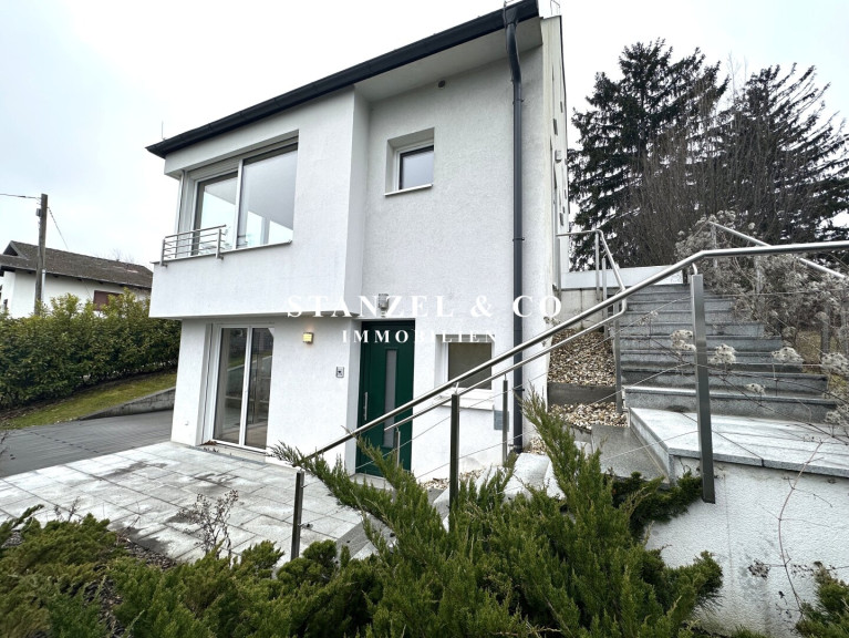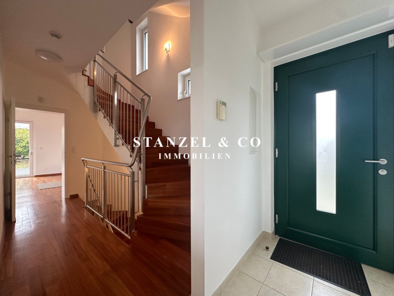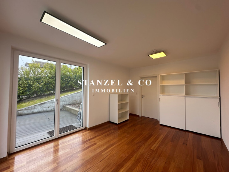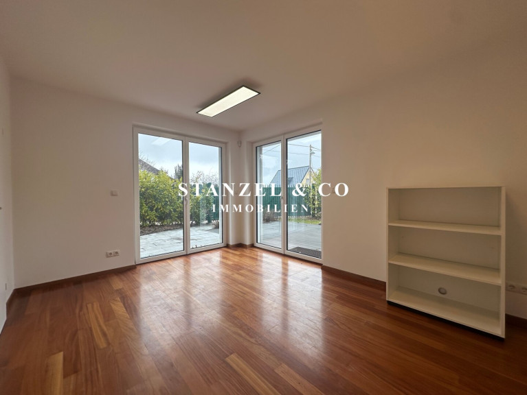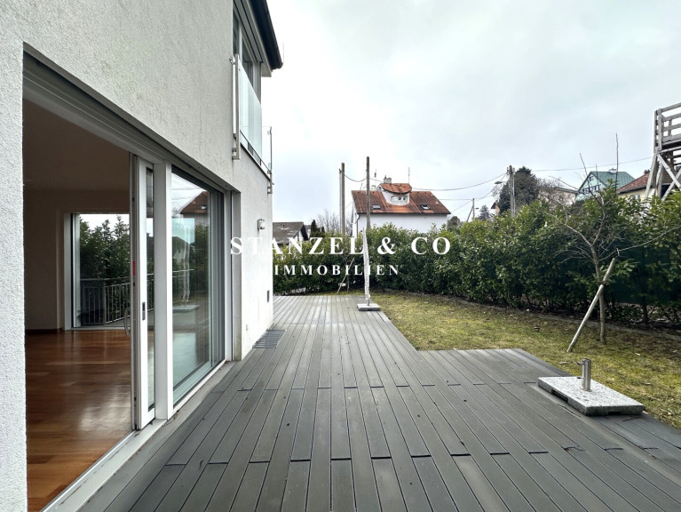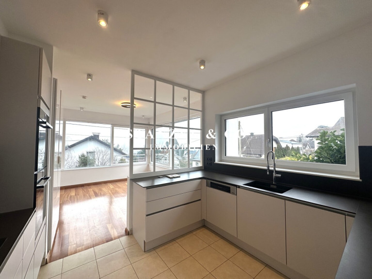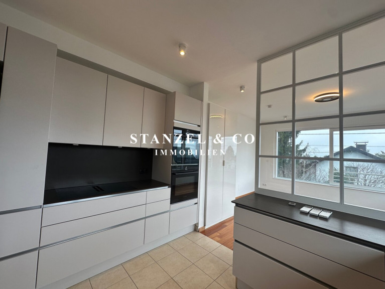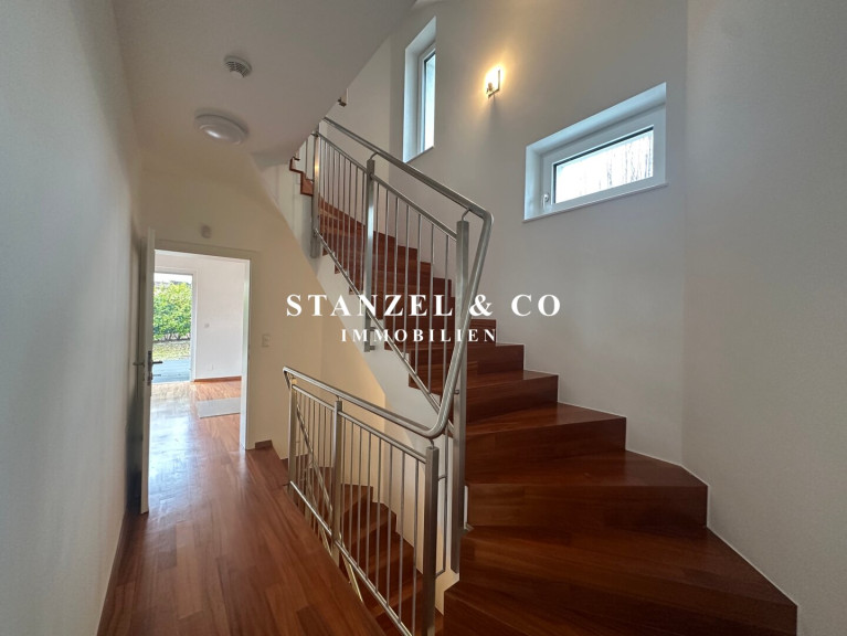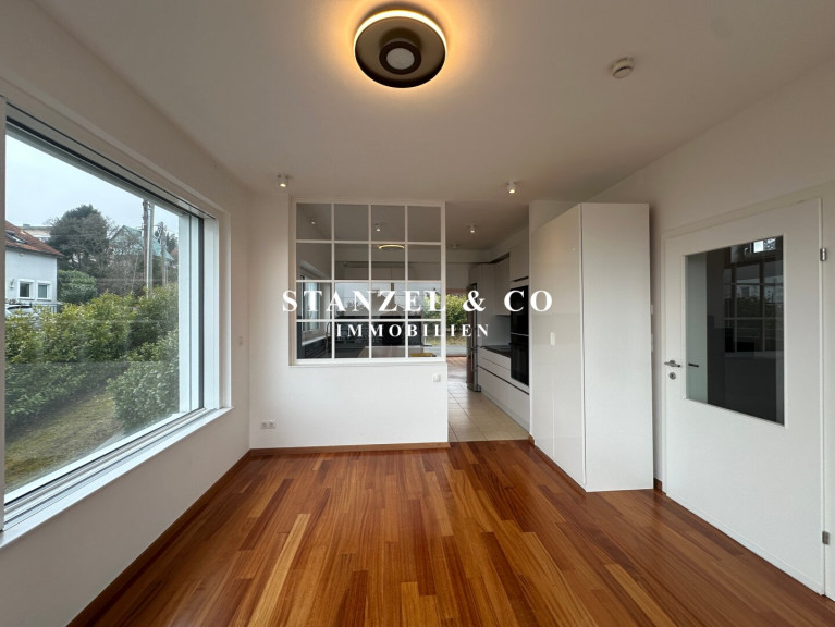 Erdgeschoss - 60m² : Vom Vorzimmer gelangt man in das schöne 26m² südwestseitige Wohnzimmer mit offenem Kamin und durch die großzügigen, gartenseitigen Terrassentüren hat man einen direkten Zugang in den 320m² Südwestgarten und zur südwestseitigen Gartenterrasse. Die moderne Küche ist mit dem Wohnzimmer verbunden und in Richtung südostseitigem Esszimmer mit einer Glasscheibe und einem Durchgang geöffnet. Die Küche verfügt über einen Geschirrspüler, Kühlgefrierkombination, Ceranfeld mit integriertem Dunstabzug und 2 Backrohre. Weiters gibt es auf dieser Ebene ein WC mit Fenster und einen Garderobenbereich.