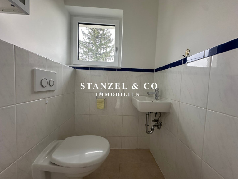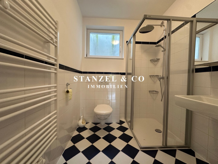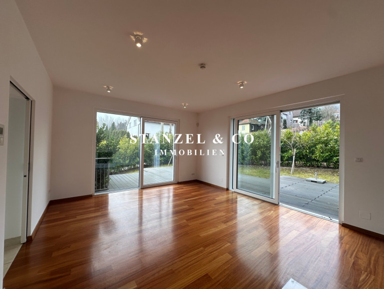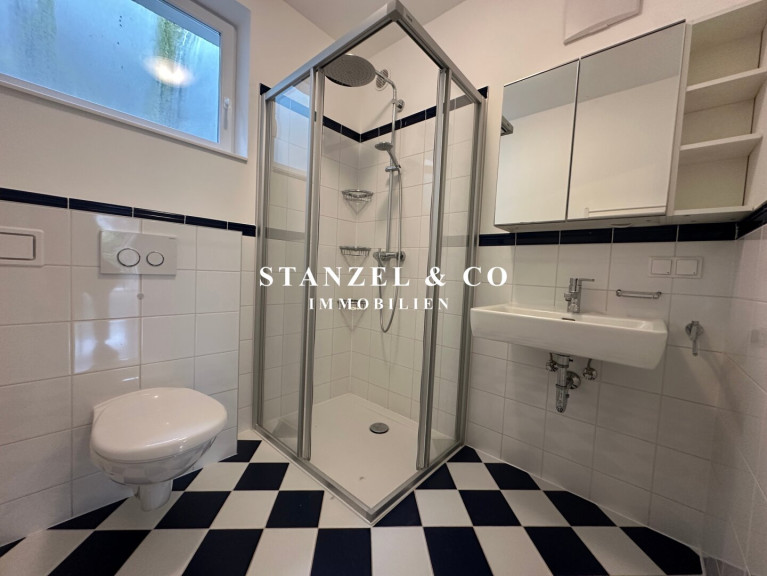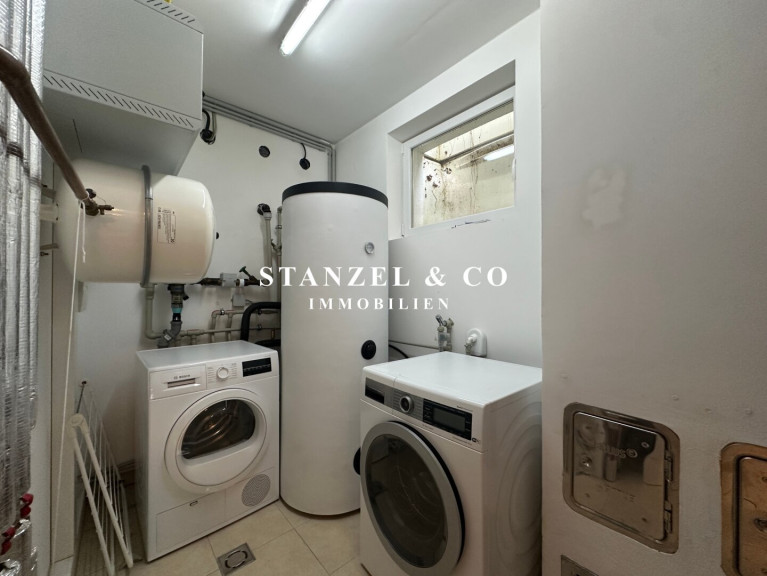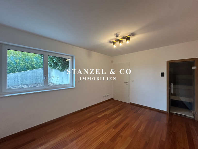 Gartengeschoss - 60m²: Auf dieser Ebene gibt es eine Einliegerwohnung, die aus einem 16m² Wohnzimmer, Teeküche, einem 14m² südseitigen Schlafzimmer mit anschließendem Badezimmer und Sauna besteht sowie über einen 2. Eingang ins Haus verfügt. Vom Wohnzimmer hat man direkten Zugang in den schönen Ostteil des Gartens. Das Badezimmer ist mit einem WC, Waschbecken und einer Glasdusche ausgestattet. Weiters gibt es auf dieser Ebene ein WC und einen Abstellraum sowie einen Waschmaschinenanschluss und einen Technikraum.