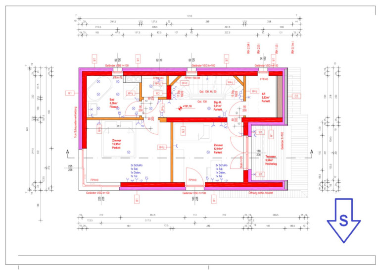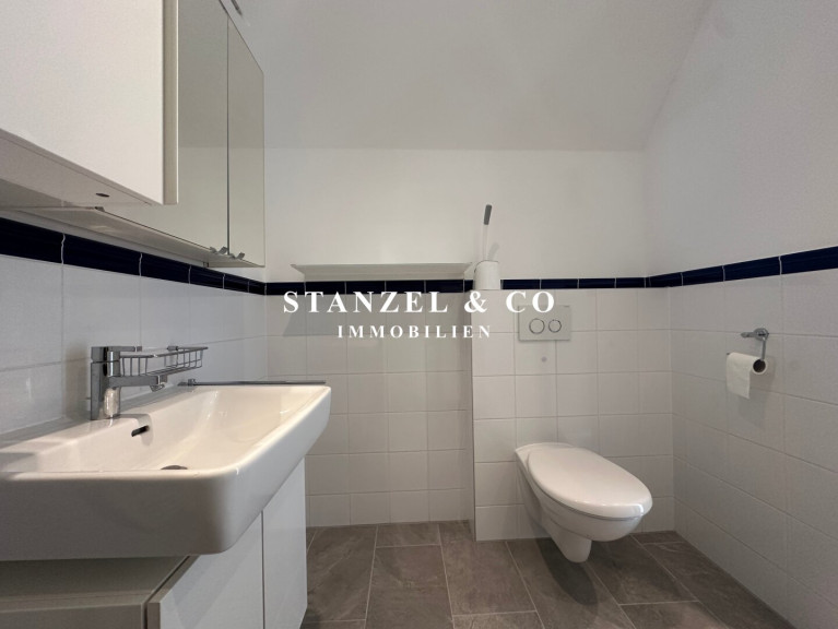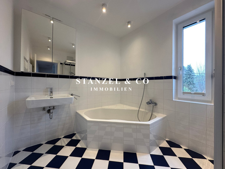Obergeschoss - 54m² : Die zwei Schlafzimmer sind zentral vom Vorzimmer aus begehbar. Das südostseitige Schlafzimmer verfügt über eine 6m² große Ostterrasse - das 16m² große Schlafzimmer ist südwestseitig. Das Badezimmer mit Fenster ist mit einer großen Eckwanne, einer Glasdusche und einem Spiegel mit Beleuchtung versehen. Das WC mit Fenster ist separat. Weiters gibt es eine 6m² begehbare Garderobe.