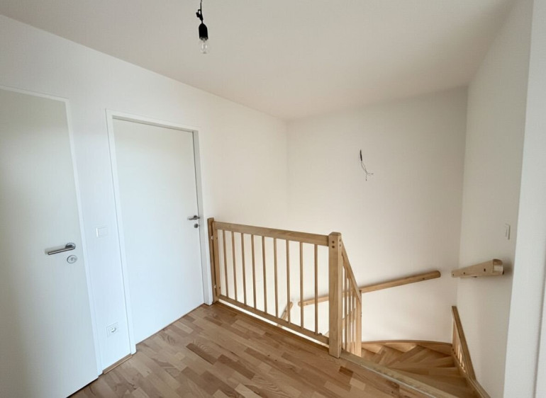 Im ersten Obergeschoss befinden sich ein einladendes Vorzimmer, ein separates WC, ein praktischer Abstellraum sowie ein großzügiges Wohnzimmer mit optimal integrierter Kochnische. Von hier aus gelangen Sie direkt auf den sonnigen Balkon – perfekt für ein Sonntagsfrühstück mit der Familie oder für gesellige Abende mit Freunden.