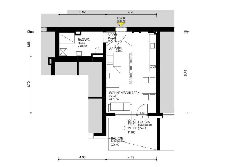 Die neue Wohnhausanlage umfasst insgesamt 20 Wohnungen, eine Tiefgarage mit 25 Stellplätzen und 4 Besucherparkplätzen im Freien. Die nagelneue Anlage wurde Mitte 2025 fertiggestellt. Die Wohnung Top 9 befindet sich im 1.OG des Gebäudes mit der Anschrift Trölstraße 12, in die Wohnung gelangen Sie bequem mit dem barrierefreien Personenlift. Die kompakte und superpraktische 1 Zimmerwohnung bietet eine Wohnfläche von ca. 36,10 m², ein absolutes Highlight ist dabei der süd-südwestseitige Balkon. Die Wohnung ist mit edlem Parkettboden sowie großformatigen Bodenfliesen und weißen Innentüren mit Holzumfassungszarge ausgestattet. Das Badezimmer verfügt über eine "Walk-in-Dusche" mit Regen- und Handbrause und Echtglas Duschtrennwand, ergänzend zum Waschtisch ist ein Waschtisch-Unterschrank und Lichtspiegel ausgeführt sowie ein elektr. Handtuchtrockner. Durch die großzügige Terrassentüre gelangt jede Menge Tageslicht in die Wohnung, für angemessene Beschattung sorgen die elektrischen Raffstore. An kalten Tagen sorgt die Fußbodenheizung für behagliches Raumklima, für Energieeffizienz sorgt die PV Anlage. Darüber hinaus ist die Wohnung mit einer hochwertigen Einbauküche ausgestattet (Achtung ohne Backrohr, Kühl- Gefrierschrank und Geschirrspüler). Ein fix zugeteiltes Kellerabteil und ein Garagenstellplatz runden das großartige Wohnungsangebot ab.