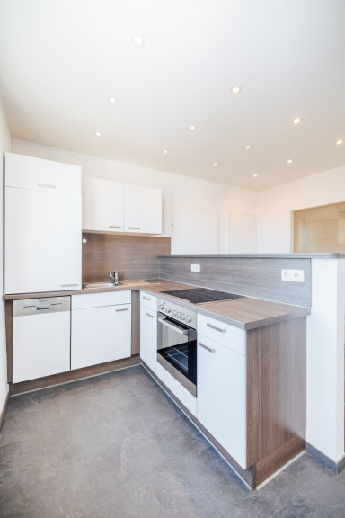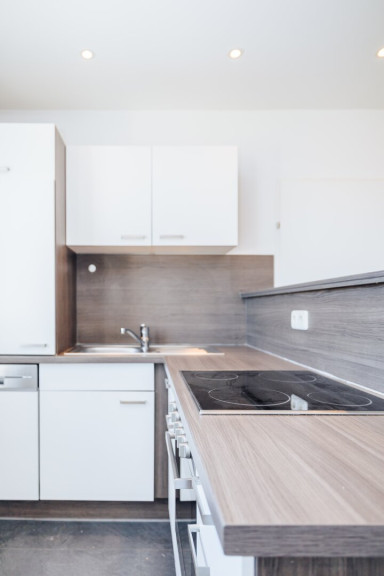 - Die moderne Küche überzeugt mit Ceranfeld, Backrohr und Kühlschrank. Sie bietet zudem ausreichend Platz für einen Esstisch – perfekt für gemütliche Abende mit Familie oder Freunden.