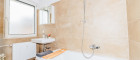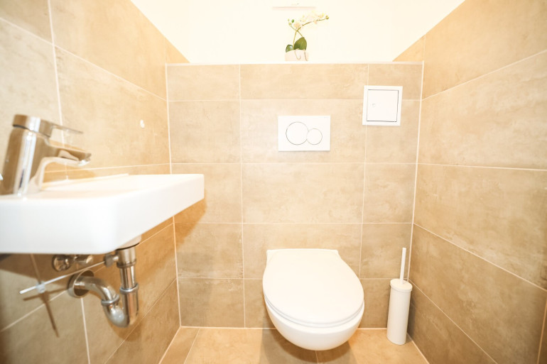 Das luxuriöse Badezimmer mit Badewanne lädt nach einem langen Tag zum Entspannen ein. Das Tageslicht und die hochwertigen Einbauspots sorgen dabei für eine harmonische Beleuchtung. Die separate Toilette mit eigenem Handwaschbecken bietet zusätzlichen Komfort.