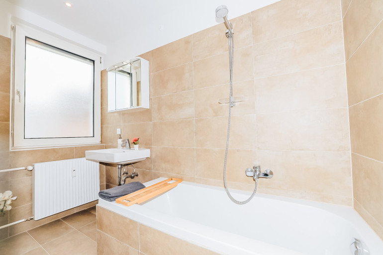 - Luxuriöses Badezimmer mit Tageslicht Das stilvolle Badezimmer verfügt über eine Badewanne, Spiegelschrank und ein großes Fenster, das für viel Tageslicht sorgt. Die hochwertigen Einbauspots sorgen auch abends für eine angenehme Atmosphäre.