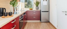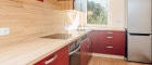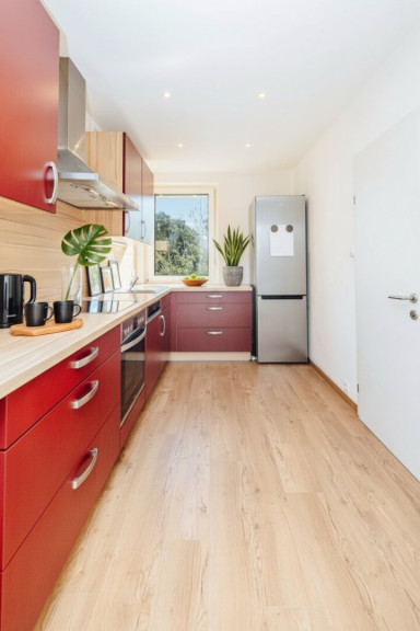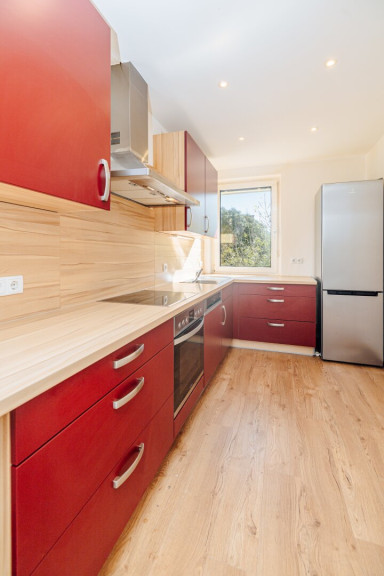 - Die moderne Küche überzeugt mit Ceranfeld, Backrohr und Kühlschrank. Sie bietet zudem ausreichend Platz für einen Esstisch – perfekt für gemütliche Abende mit Familie oder Freunden.