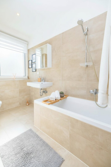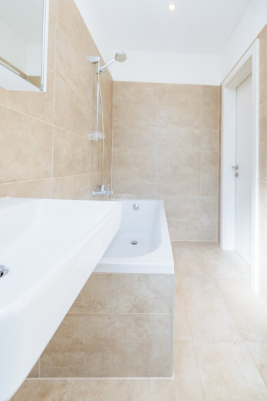 - Das Badezimmer besticht durch seine helle Gestaltung und die praktische Badewanne, die sich ideal für entspannte Momente nach einem langen Tag eignet. Eine separate Toilette sorgt für zusätzlichen Komfort. Ergänzt wird die Wohnung durch einen Abstellraum mit Waschmaschinenanschluss sowie ein Kellerabteil, das weiteren Stauraum bietet.