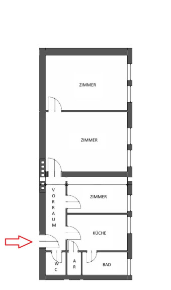 - Vom einladenden Vorraum gelangen Sie bequem in die Küche, die Toilette sowie in die beiden hellen, hintereinander begehbaren Durchgangszimmer. Zusätzlich steht ein separates, eigenständig begehbares Zimmer zur Verfügung – ideal für individuelle Wohnkonzepte.