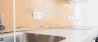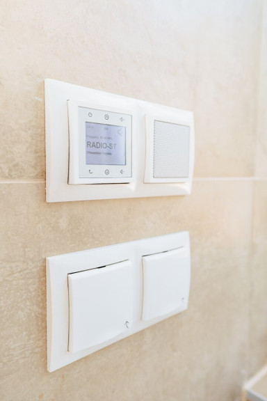 Hochwertige Sanierung: Edle Bodenbeläge, moderne Fliesen und stilvolle Decken-Einbauspots schaffen eine elegante Atmosphäre.