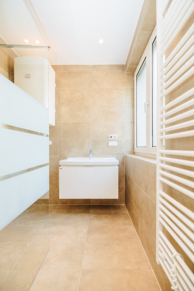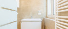 Das Badezimmer überzeugt mit stilvollem Design, ebenerdiger Dusche, großem Spiegel und viel Tageslicht durch das Fenster. Praktisch integriert ist hier auch der Anschluss für Ihre Waschmaschine. Ein separates WC sorgt zusätzlich für Komfort.