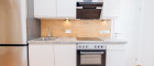 Moderne Designer-Küche: Grifflose Fronten, Ceranfeld, Backofen, Kühlschrank, Gefrierfach, Geschirrspüler und viel Stauraum.