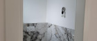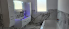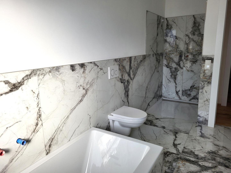 - Badezimmer möbliert mit Badewanne, Dusche, Doppelwaschtisch