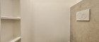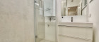 - Badezimmer mit Dusche, Waschbecken und Waschmaschinenanschluss