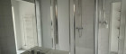 - Badezimmer mit Dusche, Fenster und einem separaten Raum für die Waschmschine