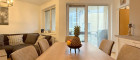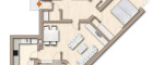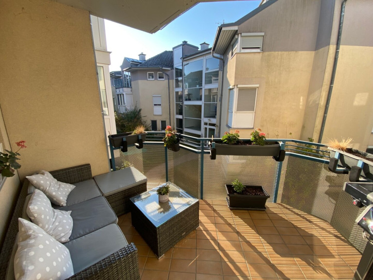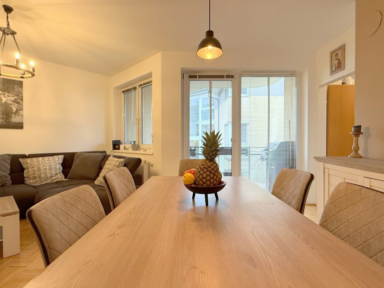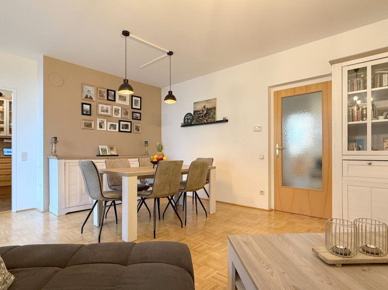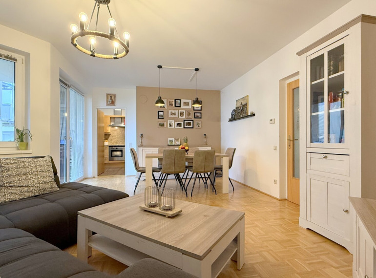 Das Wohnzimmer liegt rechter Hand und ist in seiner Form alles andere als gewöhnlich. Durch seine leichte Zuspitzung und die klare Gliederung wirkt es lebendig und dennoch strukturiert. Der Essbereich fügt sich harmonisch ein, ohne dem Wohnteil Konkurrenz zu machen. Man kann hier Gäste empfangen, zusammensitzen, lachen – oder einfach nur einen ruhigen Abend verbringen. Der Balkon schließt direkt an und erweitert den Raum nach draußen, fast wie eine natürliche Verlängerung des Wohnens.