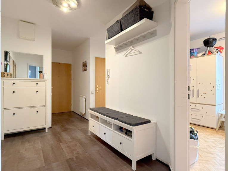 Zurück im Zentrum der Wohnung – dem großzügigen Vorzimmer – zeigt sich noch einmal, wie besonders dieser Grundriss ist. Kein enger Verteiler, kein schmaler Gang, sondern ein echtes Herzstück, von dem aus sich alles entfaltet. Hier kommt man an. Und entscheidet sich intuitiv, wohin es weitergeht.