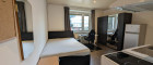 - Hauptraum: Wohnbereich mit Küchenblock. Durchdachte Raumnutzung mit Raumtrenner, der den Schlafbereich vom Badezimmer abtrennt.