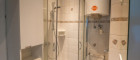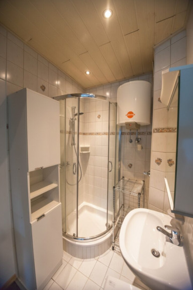 - Badezimmer: Badezimmer mit Dusche, Waschbecken und Boiler.