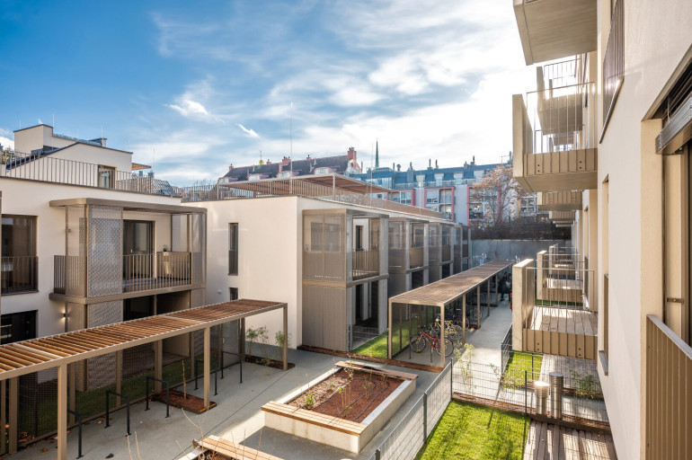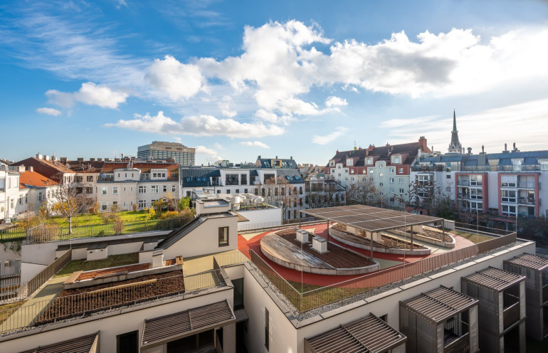Das Haus selbst verfügt neben Waschküche, Fahrradabstellraum, großzügigen Fahrrardstehern im Freien, Kinderwagenraum, Postboxen und nachhaltigen Grünanlagengestaltungkonzept auch über eine eigene Laufbahn/Gemeinschaftsterrasse am Dach des Hofgebäudes. Darüber hinaus stehen in der hauseigenen Tiefgarage PKW als auch Motorradstellplätze zur Verfügung (gegen Aufpreis).