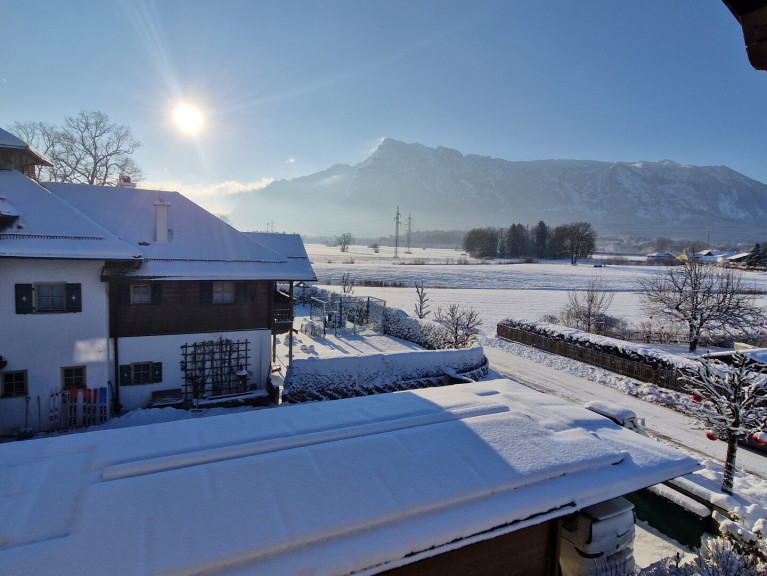 Großzügiger Vorraum, helles Wohnzimmer mit Balkon und freiem Blick zum Untersberg, separate komplett ausgestattete Küche mit Fensterband und Stehbar, zwei flexibel nutzbare Zimmer (Schlafen/Home-Office), Badezimmer mit Wanne und Fenster, WC separat.