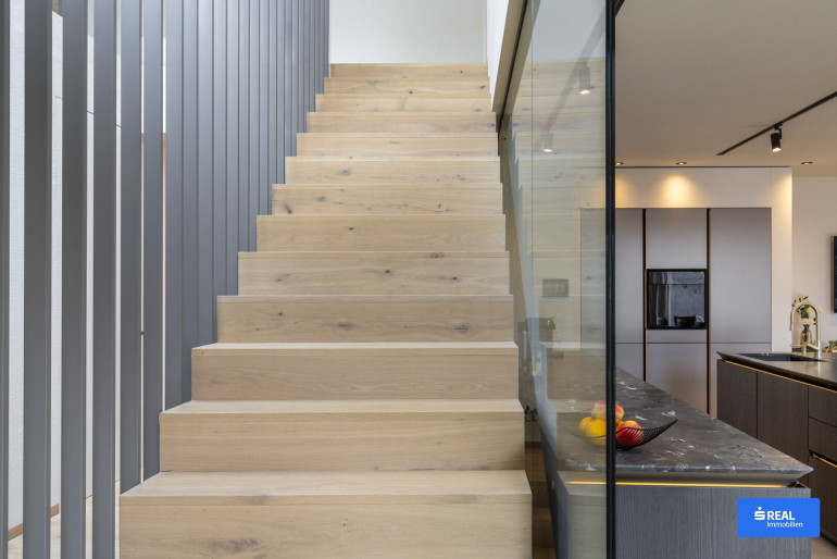 Bereits beim Betreten wird die besondere Atmosphäre dieses exklusiven Refugiums spürbar. Die außergewöhnliche Raumaufteilung und die nahtlose Einbindung des stufenförmig angelegten Gartens verleihen dem Haus ein einzigartiges Licht- und Raumkonzept, das sich wie ein roter Faden durch alle Ebenen zieht. Großzügige Fensterfronten öffnen den Blick in die unterste Gartenebene und lassen das natürliche Tageslicht ungehindert in die Räume strömen – ein seltenes Zusammenspiel von Transparenz, Offenheit und Weite.