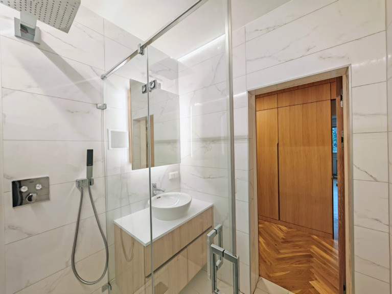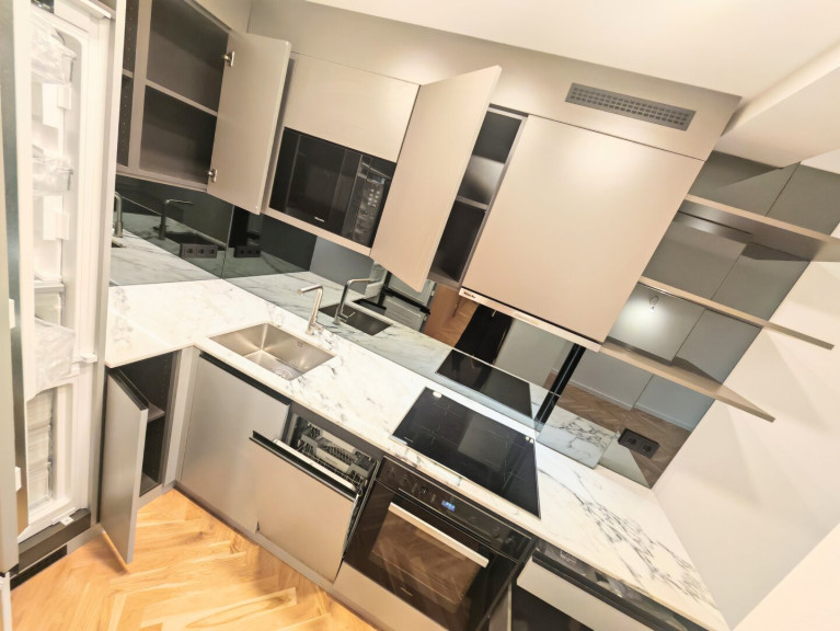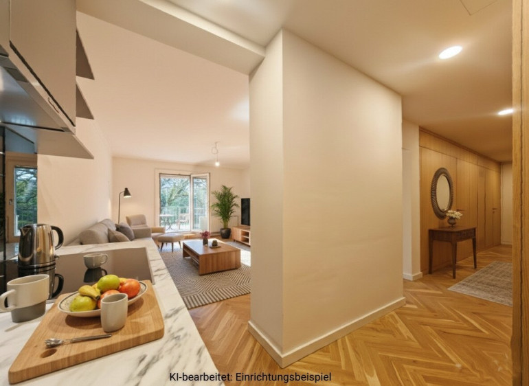 Diese Wohnung wurde kürzlich umfassend und stilvoll in modernem Design renoviert. Das gesamte Vorzimmer ist mit Holzvertäfelung ausgestattet, wodurch Zimmertüren und Stauraumlösungen harmonisch in die Wandgestaltung integriert werden. Dies sorgt für ein hochwertiges und zugleich wohnliches Ambiente. Die Raumaufteilung ist besonders effizient: Es wurden Garderoben sowie separate Schränke für Therme und Waschmaschine geschaffen, um jeden Quadratmeter optimal zu nutzen.