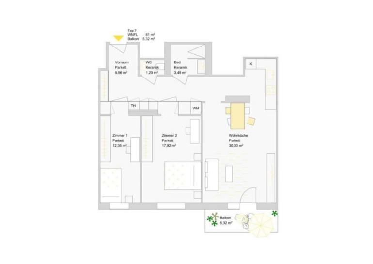 Auf einer Fläche von rund 81 m² befinden sich zwei Schlafzimmer, ein offen gestaltetes Wohnzimmer mit Übergang zum Vorzimmer und zur Küche, ein WC sowie ein Duschbad. Der großzügige Balkon bietet einen herrlichen Blick in den Botanischen Garten des Schönbrunns und stellt eine attraktive Freifläche mit ansprechender Aussicht dar.