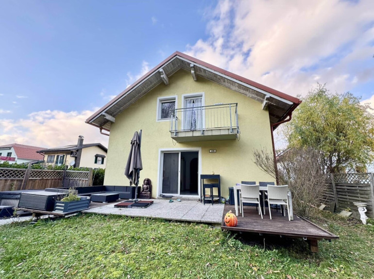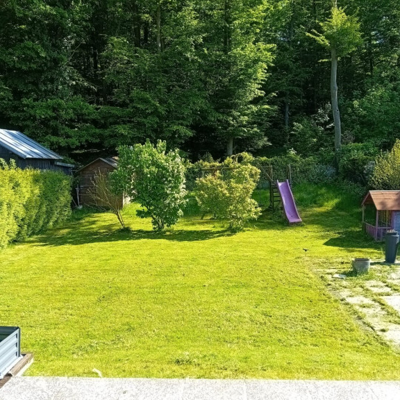 Der idyllische, ebene Garten mit freiem Grün- und Waldblick bietet angenehme Ruhe und viel Privatsphäre. Die Terrasse wurde erweitert und bietet ausreichend Platz für schöne gemütliche Stunden.