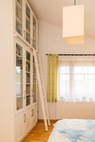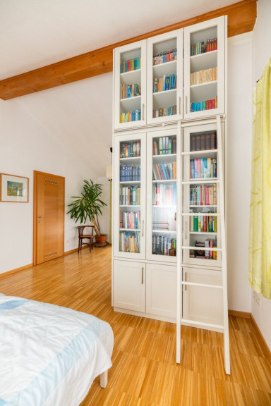 Im oberen Geschoss sind zwei Räume (je ca. 21 m²), ein Schrankraum und ein weiteres Badezimmer sowie eine Toilette untergebracht. Beide Ebenen haben einen Balkon nach Südwesten Richtung Garten. Den durchdacht gestalteten Garten betreten Sie über ein weiteres Wohnzimmer in der unteren Ebene.