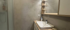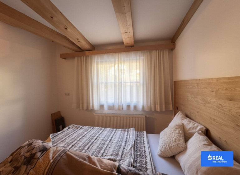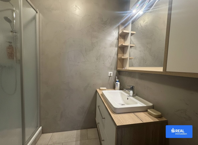 Im Obergeschoss befindet sich eine Wohnung mit einer Wohnküche, zwei Zimmern mit jeweils eigenem Badezimmer inklusive WC sowie einem zusätzlichen separaten WC.