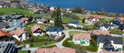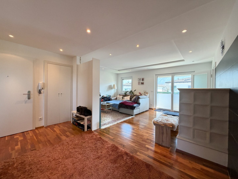 Das Herzstück der Wohnung bildet das großzügige Wohnzimmer mit hochwertigem Echtholz-Nussboden und gemütlichem Kachelofen. Große Fensterflächen sorgen für viel Tageslicht und öffnen den Blick auf den See und die markante Drachenwand.