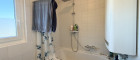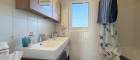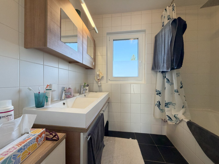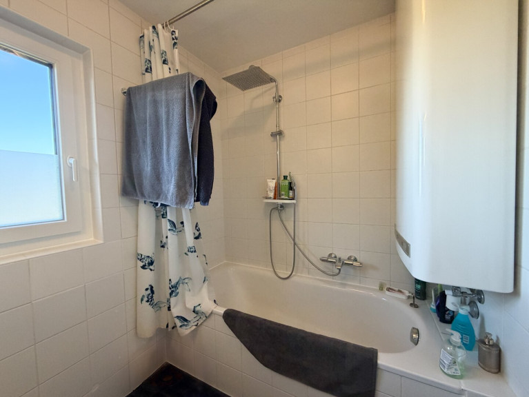 - Badezimmer mit Doppelwaschtisch, Badewanne, Warmwasserboiler und Fenster im OG