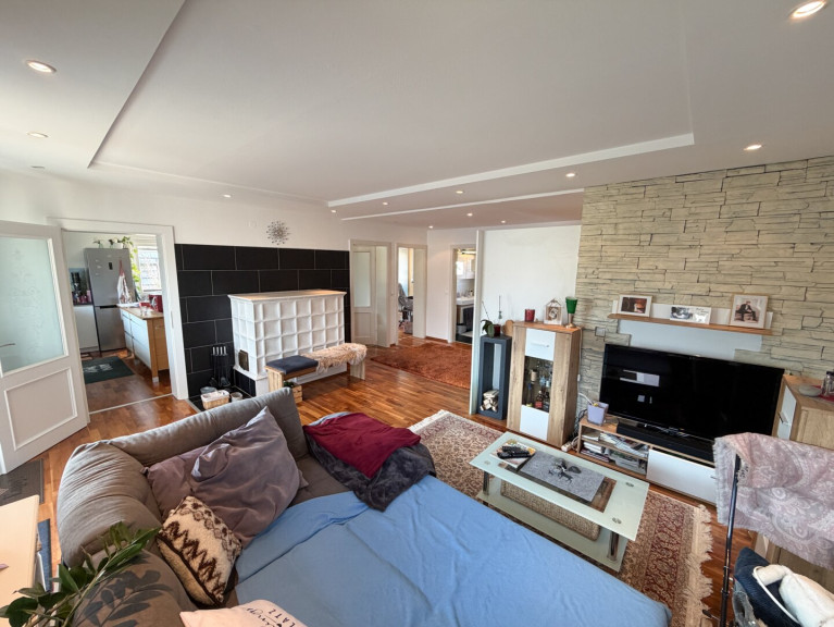 - großzügiger Wohn-Essbereich mit Echtholz-Nussboden & Kachelofen