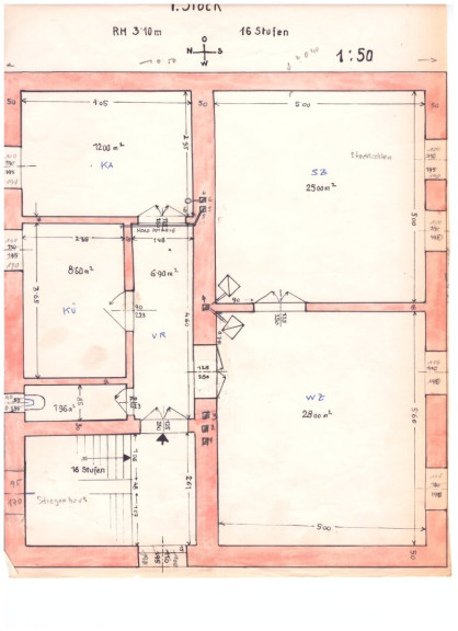 Ein gemeinsames Stiegenhaus führt in den ersten Stock: Hier stehen ein großer Salon, zwei Zimmer, eine Küche und ebenso eine Toilette mit Fenster zur Verfügung.