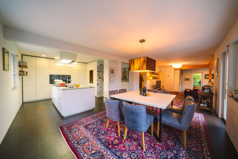 Der weiträumige, lichtdurchflutete Wohn- und Essbereich vermittelt dank seiner offenen Gestaltung ein besonders angenehmes Wohngefühl. Große Fensterflächen schaffen eine helle und freundliche Atmosphäre und bieten zudem direkten Zugang zur Terrasse – ideal für entspannte Stunden im Freien oder gesellige Abende mit Familie und Freunden.