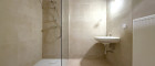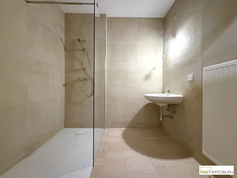 Das modern verflieste Badezimmer ist mit einer komfortablen Dusche ausgestattet.