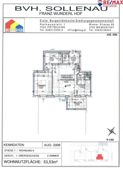 Die Wohnung befindet sich im 1. Obergeschoss einer ca. im Jahr 2006 errichteten Wohnhausanlage und verfügt über eine Wohnfläche von ca. 53,53 m². Ein ca. 5,73 m² großer Balkon erweitert den Wohnraum nach außen und bietet Platz für gemütliche Stunden im Freien. Zusätzlich gehören ein Kellerabteil sowie ein Parkplatz im Freien direkt vor dem Haus zur Wohnung – dieser ist bereits im Kaufpreis inkludiert.