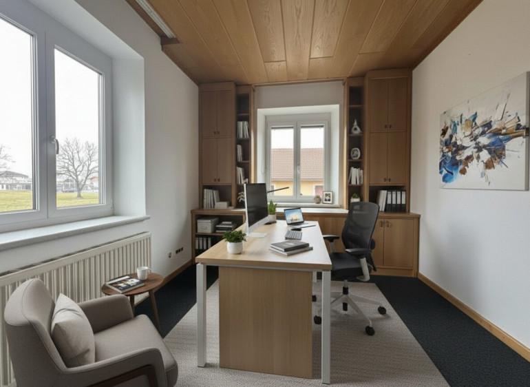 - Separates Büro mit praktischen Einbauschränken, die ausreichend Stauraum bieten