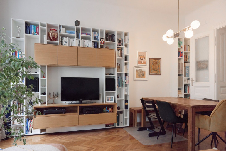 Die maßgefertigte Tischlerküche überzeugt mit hochwertiger Ausstattung, durchdachtem Stauraum und einem einladenden Bartisch – ideal für geselliges Kochen und Verweilen. Auch das Vorzimmer kann mit Tischlereinbauten aufwarten.
