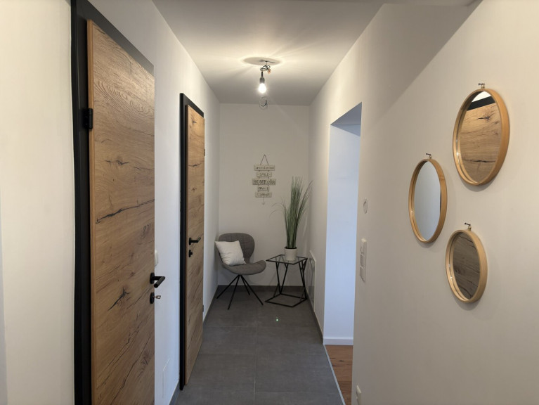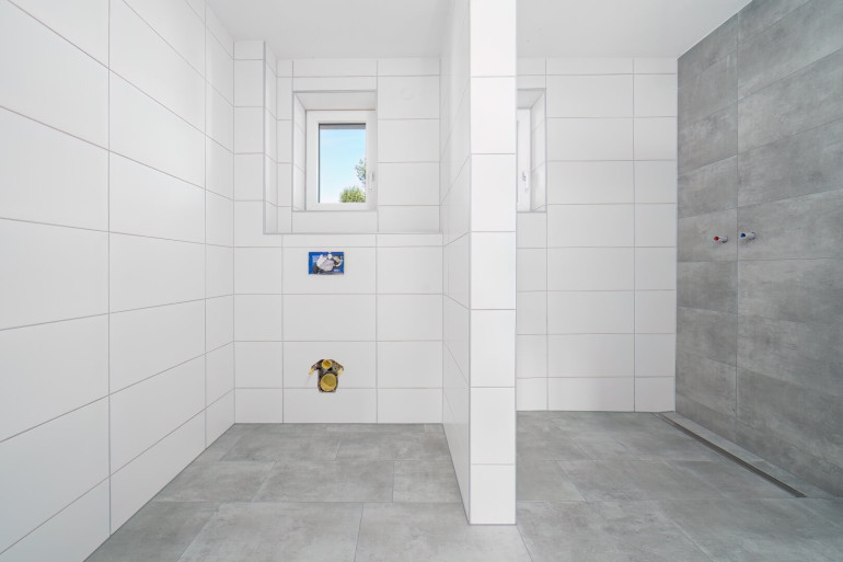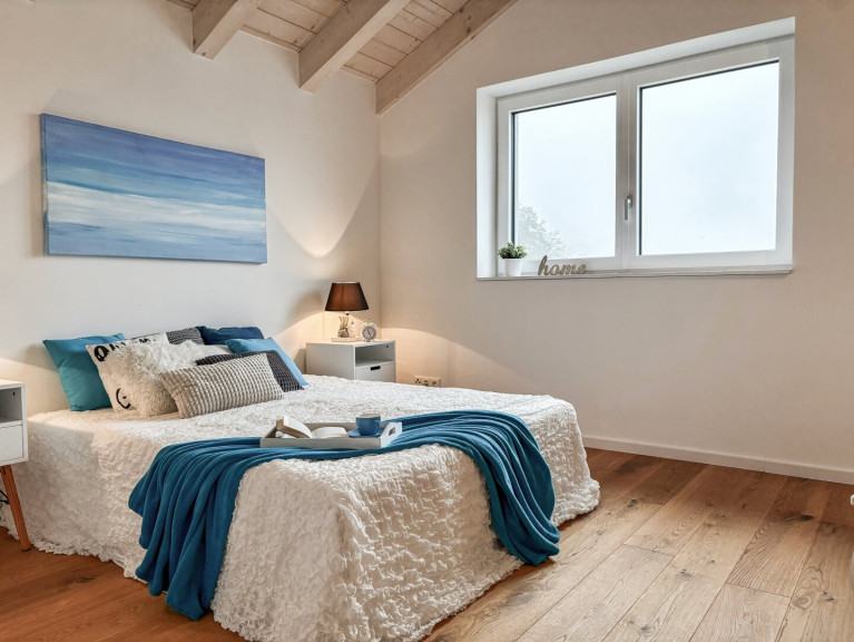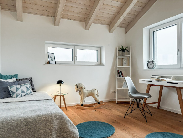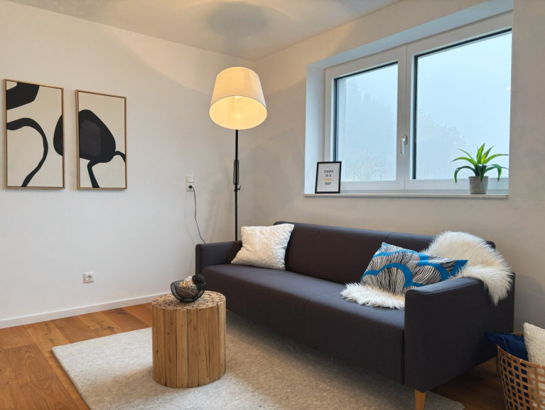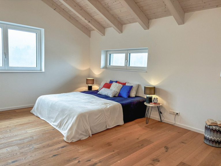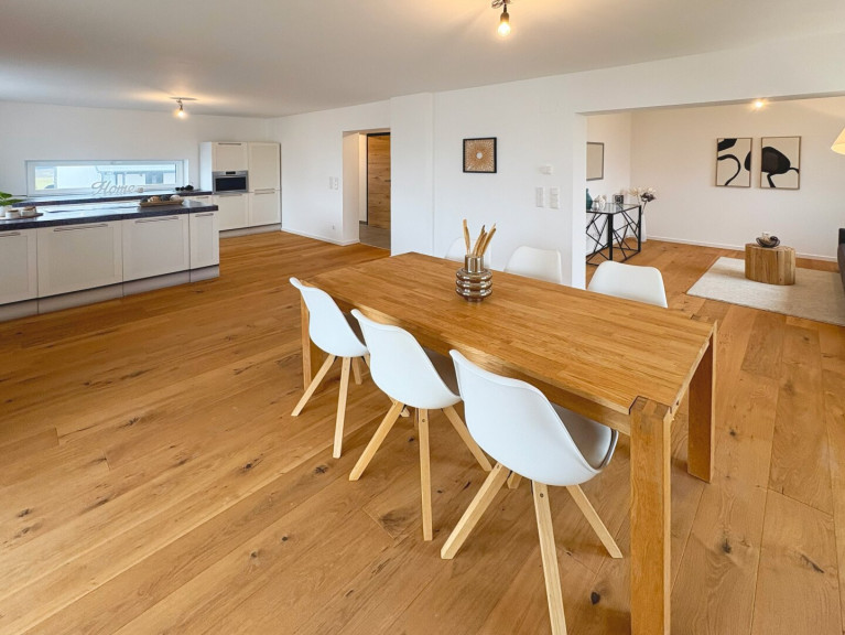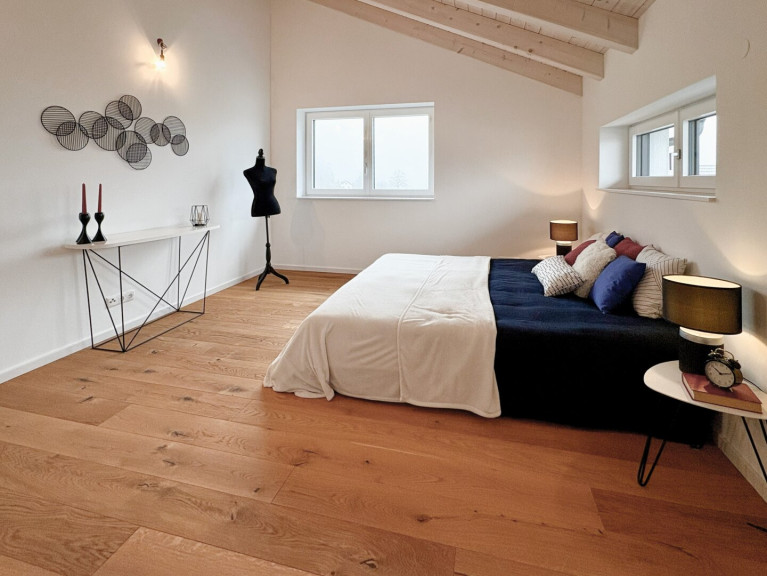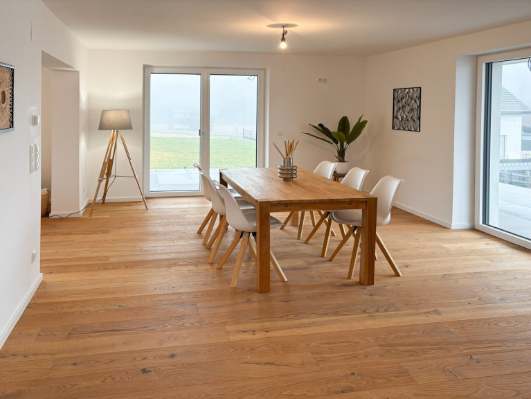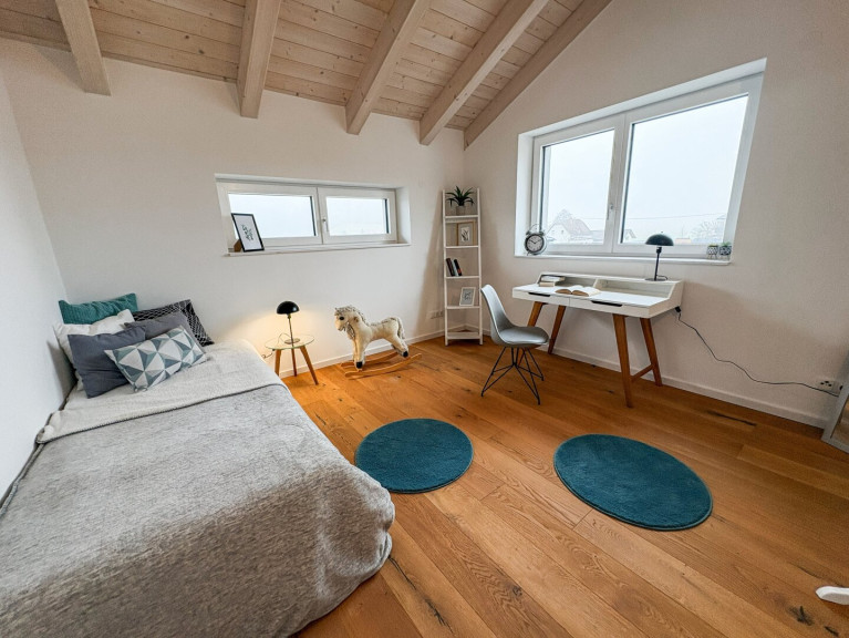 Im Erdgeschoss erwarten Sie ein lichtdurchfluteter Wohn-Essbereich mit weitläufigen Fensterfronten und direktem Zugang zur überdachten XXL-Terrasse & eine moderne offene Küche. Das Obergeschoss verfügt über ein großzügiges Hauptschlafzimmer, zwei weitere helle Schlafzimmer sowie ein komfortables Familienbad mit Badewanne, Dusche und WC. Für höchsten Wohnkomfort sorgen zahlreiche Ausstattungsdetails wie Fußbodenheizung mit Einzelraumregelung, Luftwärmepumpe, elektrische Rollläden und Glasfaseranschluss.