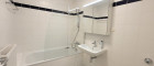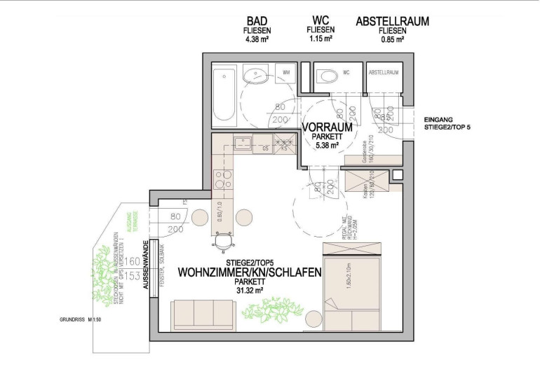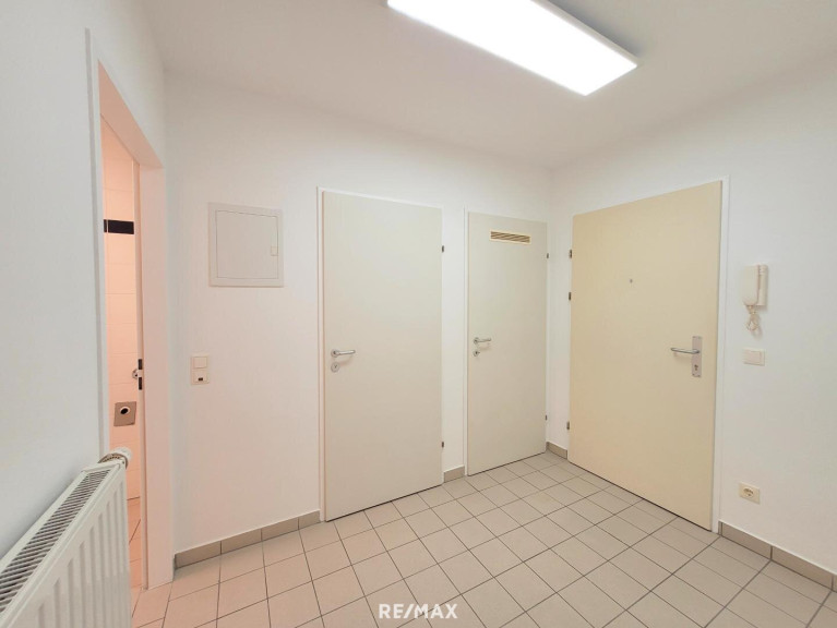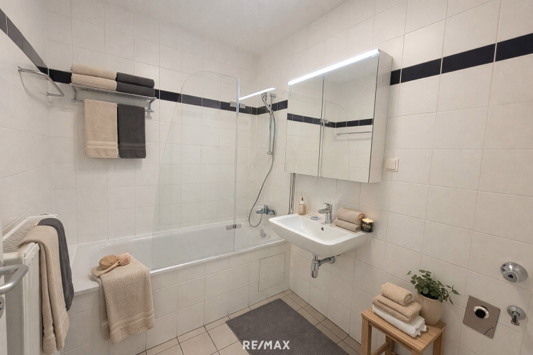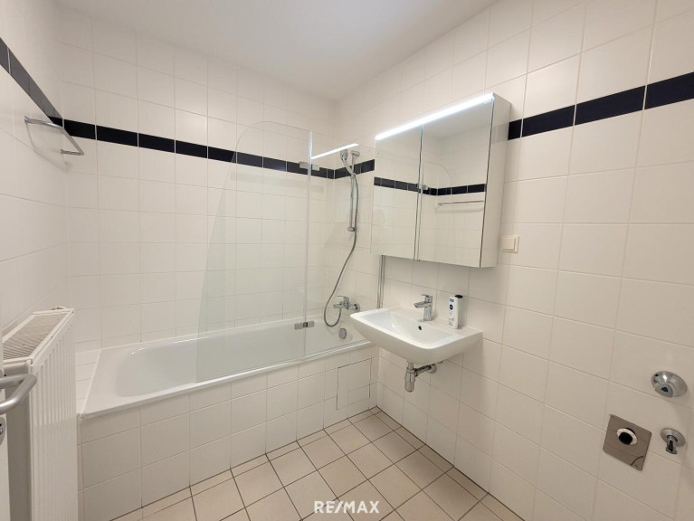 Vom geräumigen Vorraum gelangt man in den Abstellraum, das extra WC, den Wohnraum und das Badezimmer. Dieses hat eine Badewanne mit Duschwand, ein Waschbecken, einen Spiegelschrank und einen Waschmaschinenanschluss.