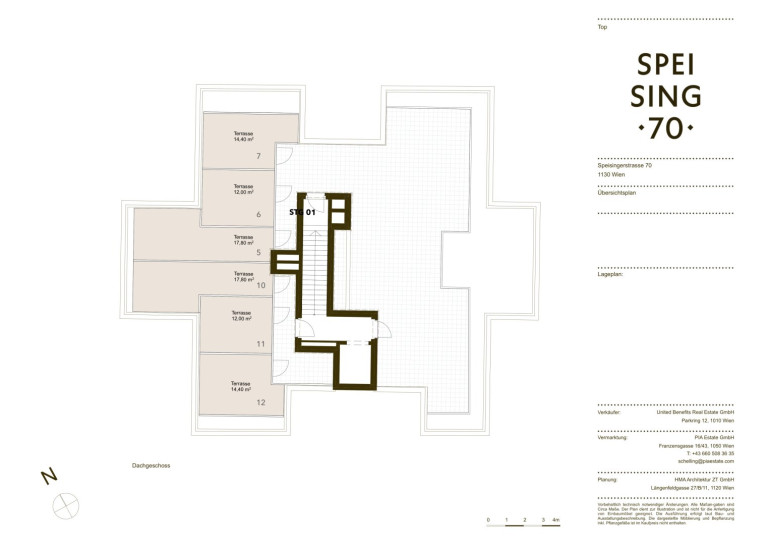 Über dem straßenseitigen Bauteil ist eine Dachterrasse mit Summer Kitchen und Außendusche geplant. Diese wird allen Bewohnern die Möglichkeit bieten, über den Dächern Wiens auszuspannen und den Weitblick zu genießen. Darüber hinaus verfügen ausgewählte Wohnungen über westseitig ausgerichtete, zugeordnete Dachterrassenabteile zur exklusiven Nutzung.